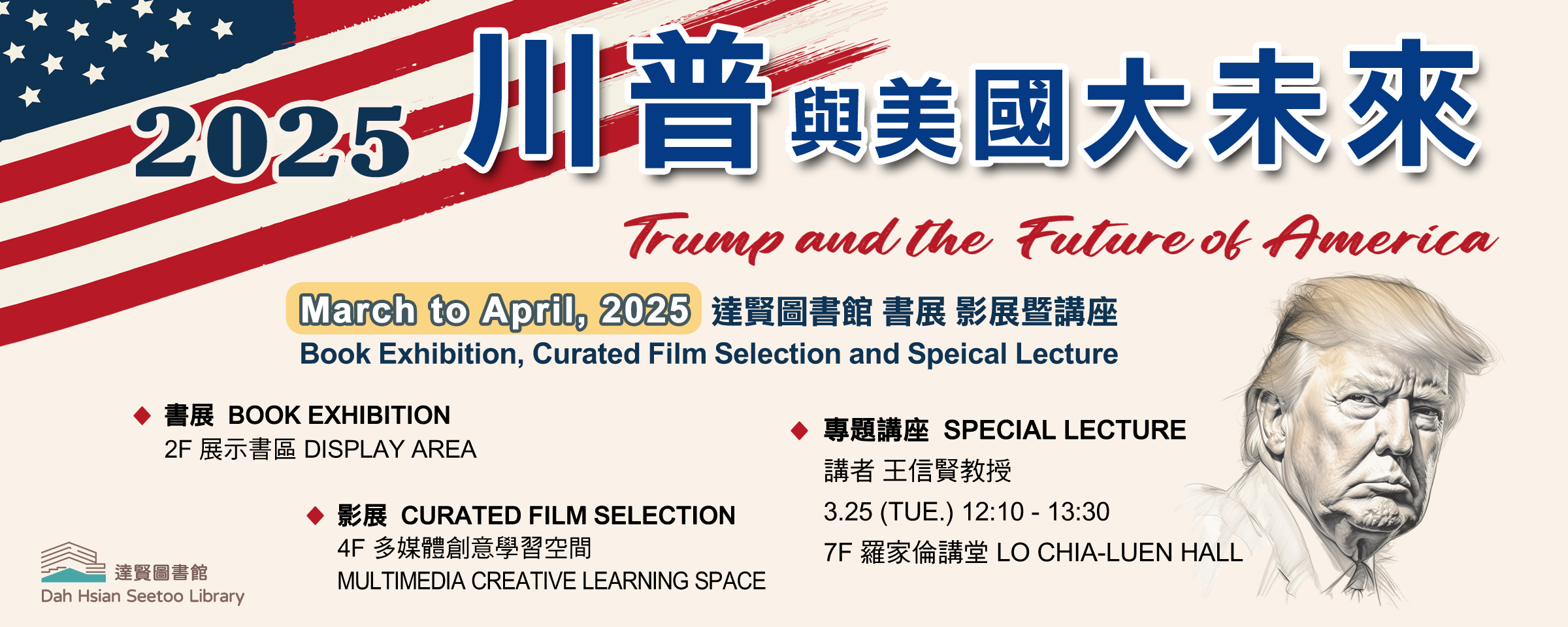 本次書展以川普政府的 20 項核心政見為主軸,精選中英文館藏,包括八大子題 (一) 川普、川普主義及其政府、(二)移民與邊境安全、(三)經濟與能源政策、(四)軍事與國防、(五)城市與社會安全、(六)憲法與公民自由、(七)教育與文化、(八)民生與福利等領域,為讀者提供多角度探索川普時代政策脈絡及影響。 除了書展外,本次活動更特別規劃影展及專題講座,邀請本校東亞所特聘教授兼國際關係研究中心主任王信賢教授深入剖析川普政策的影響,並與讀者一同探討台灣應如何因應這場全球變革。